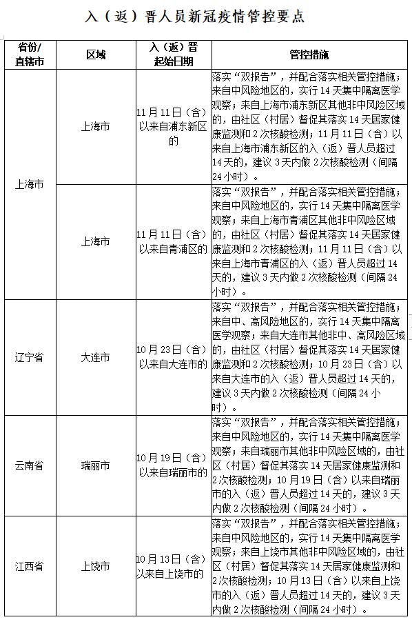 1.请有国内中、高风险地区旅居史或与通报病例行程轨迹有交集的入(返)晋人员,第一时间落实“双报告”,并配合落实相关健康管理措施。来自国内中、高风险地区,按照要求实行14天集中隔离医学观察;来自中、高风险地区所在城市其他非中、高风险区域的,由社区(村居)督促其落实14天居家健康监测和2次核酸检测。入(返)晋人员新冠疫情管控要点详见附表。广大群众如有需要可拨打市疾控中心咨询热线(85673736)或市民服务热线12345。